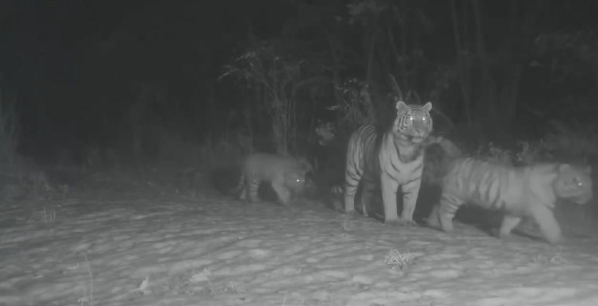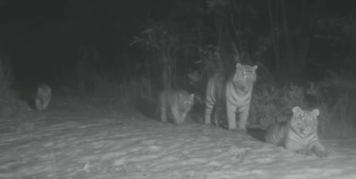 同在11月的珲春保护地,另一段令人屏息的“五虎同框”影像悄然出现——在一个地球自然基金会支持的反盗猎与人兽冲突预警系统的视野里,幽暗的林影之间,一只母虎带着四只幼崽缓缓步入镜头。母虎的身形沉稳有力;四只小虎紧随其后,轻快的步伐里满是对世界的探索与好奇。母虎大约5-8岁,幼崽约6-8个月,判断是今年出生的小老虎。